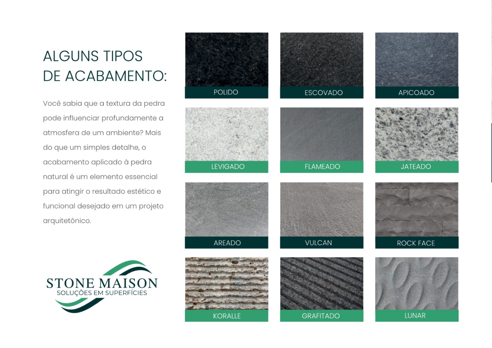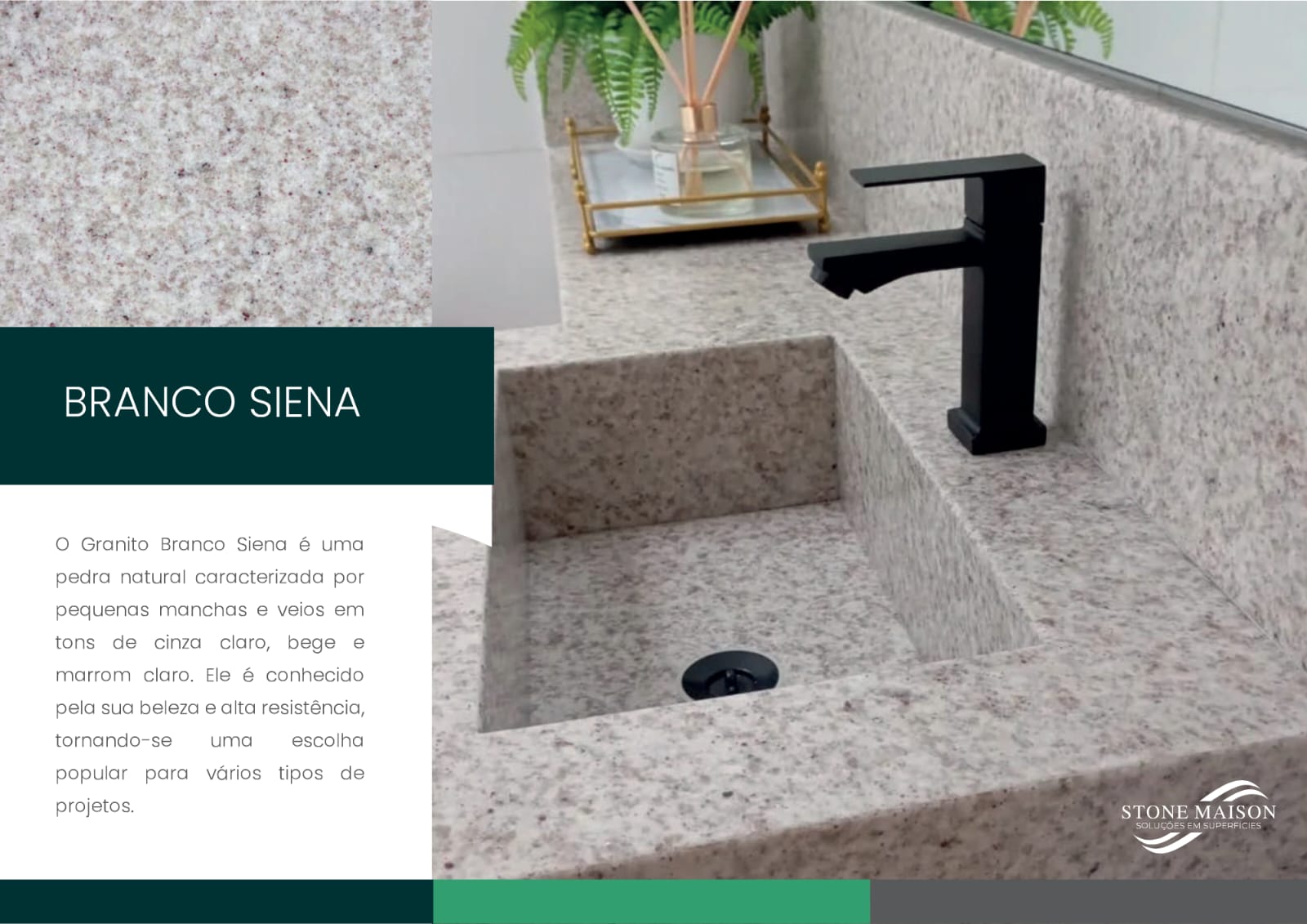 desde 2021, a stone maison vem construindo uma trajetoria solida no mercado de rochas ornamentais, destacando-se Pela curadoria refinada de mármore, granito, superfícies sintéticas e lâminas ultracompactas. Nosso propósito é oferecer materiais Que unem estética, qualidade e funcionalidade, proporcionando soluções versáteis para projetos residenciais, corporativos e comercias. Cada item do nosso portifólio é cuidadosamente selecionado para inspirar e transformar espaços, atendendo a expectativa de profissionais exigentes e clientes que valorizam design, sofisticação e durabilidade.